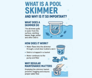Think of the skimmer as your pool’s “first line of defense.” Its job is to pull in water from the surface, catching leaves, bugs, pollen, and other debris before they sink to the bottom. This makes cleaning much easier and helps your filtration system work more efficiently.